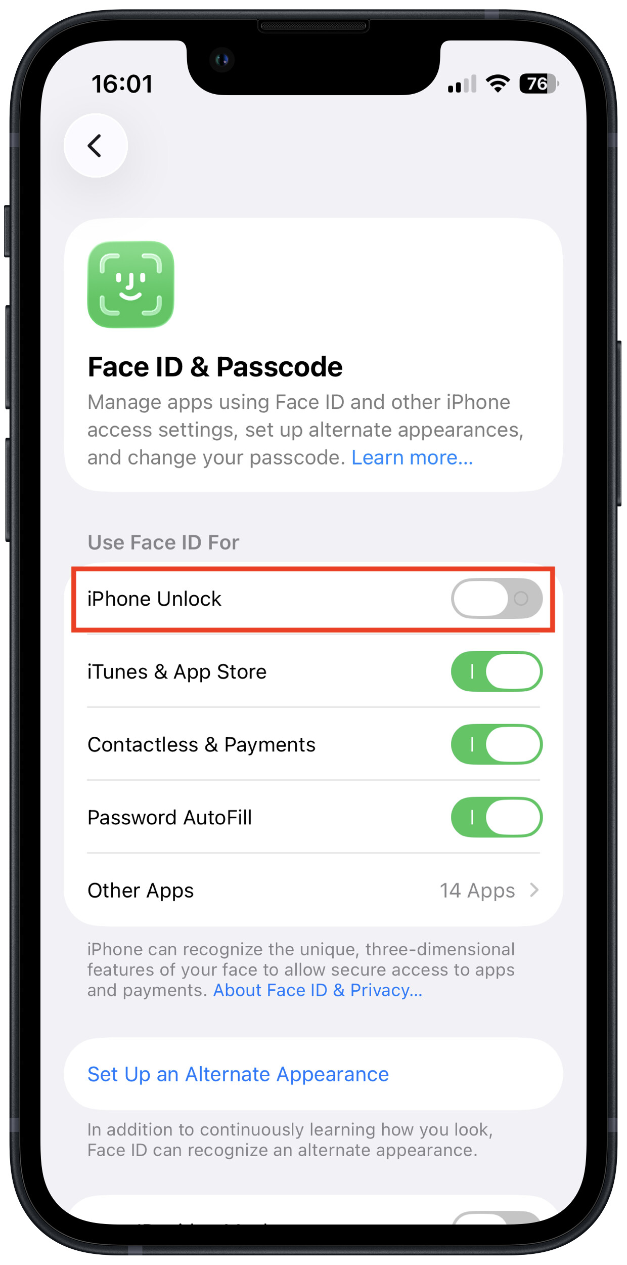 Thanks for that reminder. Settings → Face ID & Passcode: