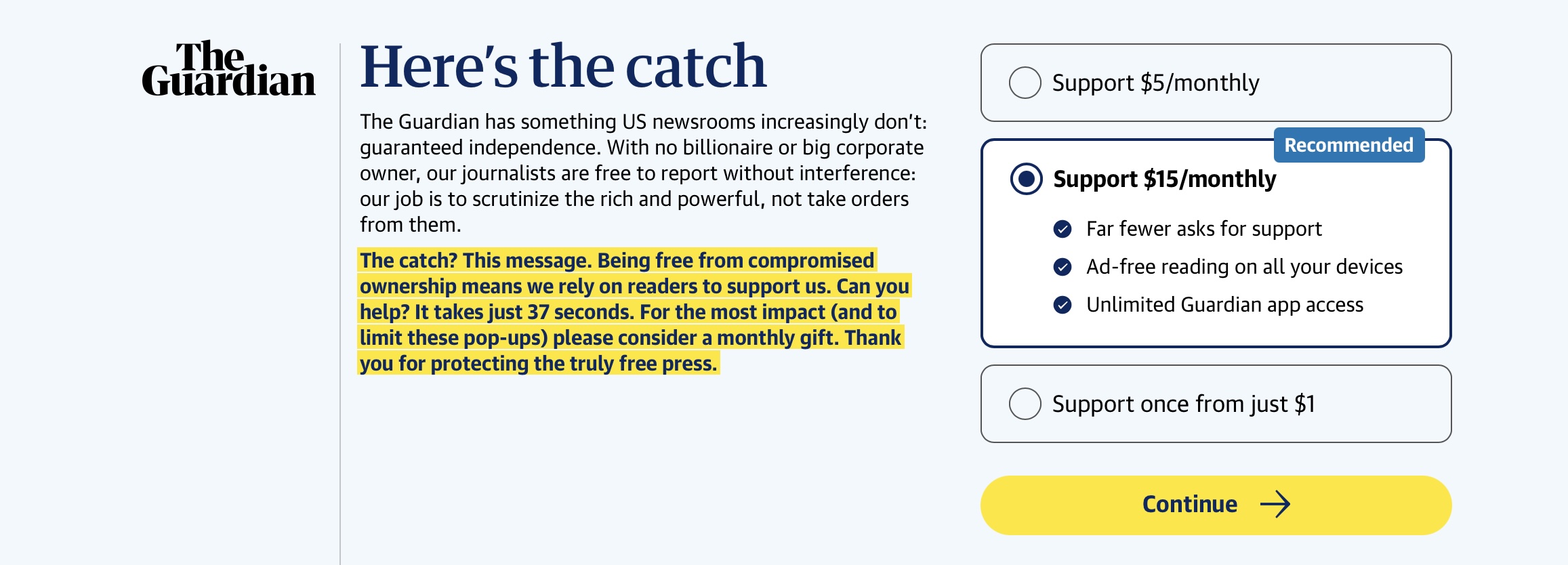 Regarding access to The Guardian, I have subscribed to its feed in the RSS reader Reeder App for a long time. This year (or recently anyway) a dialog began appearing, when clicking on the article headline to view on the web, that gives the visitor the choice of being tracked by up to 133 partners and seeing ads, or subscribing with money and seeing generic ads. That is sorta kinda a paywall, pay with money or privacy.