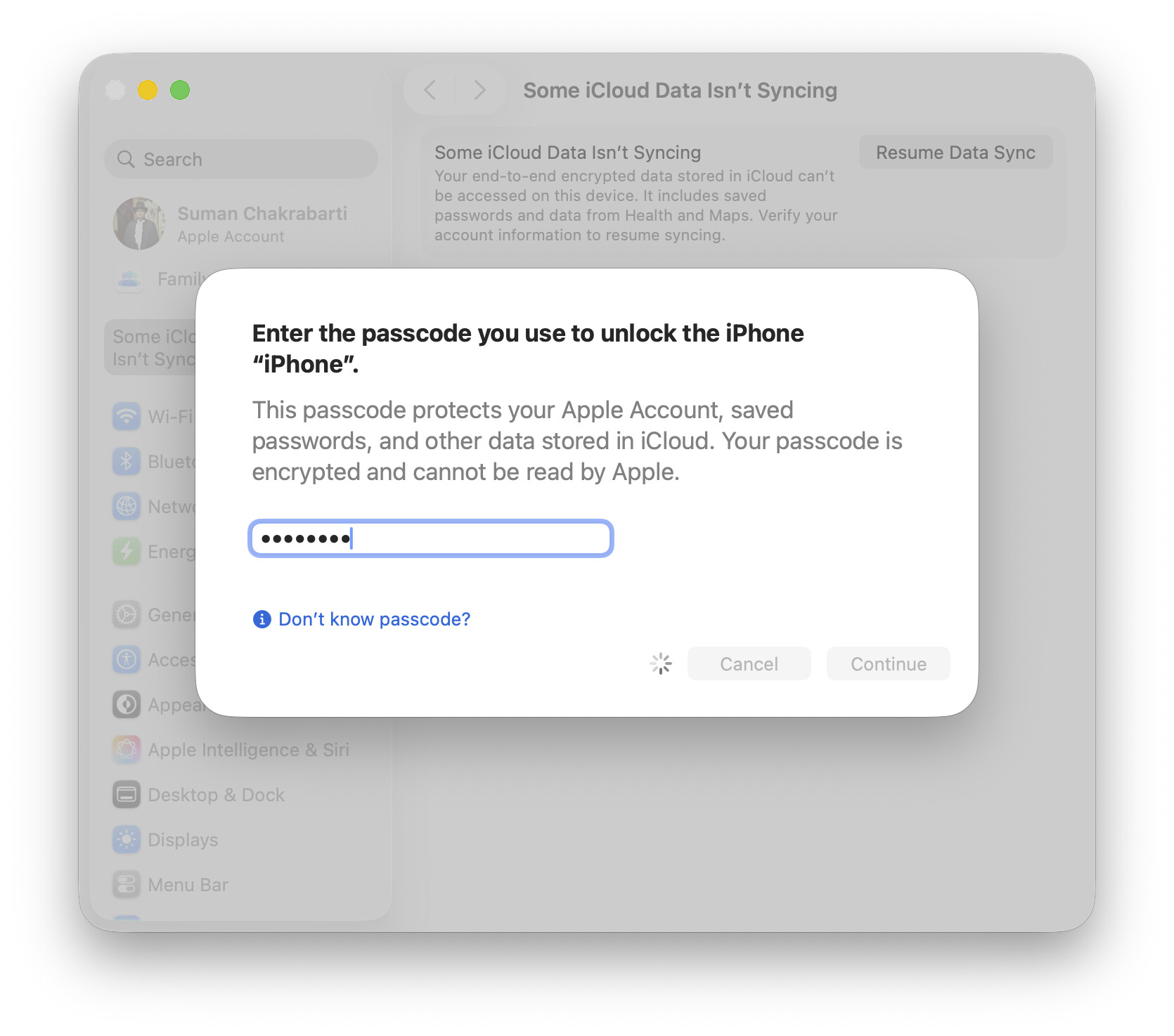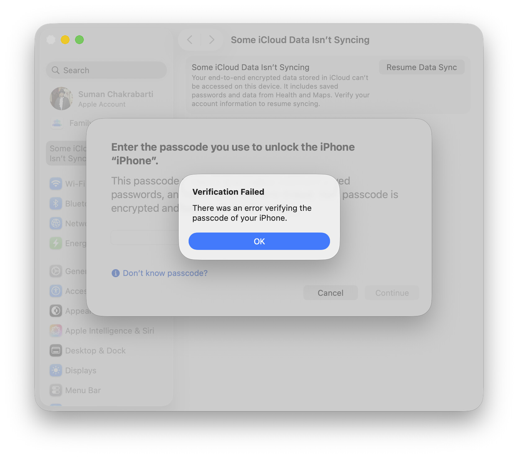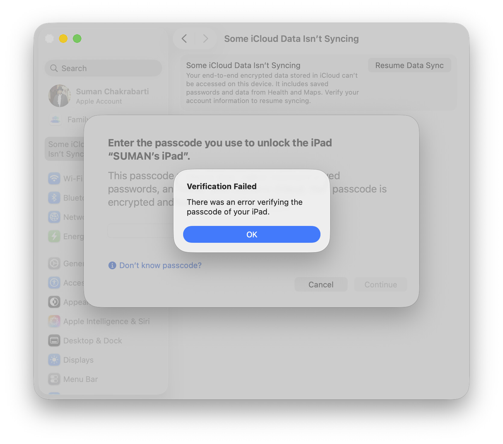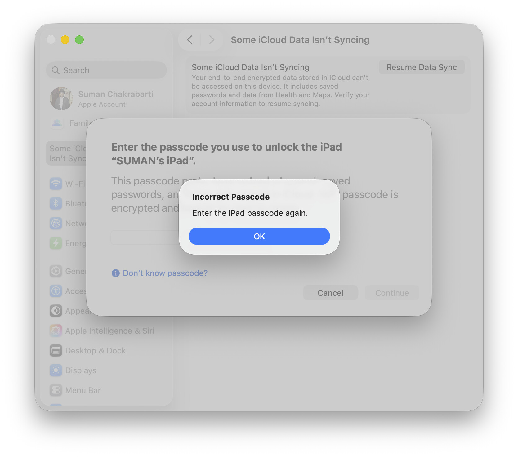 This sequence of three screen shots is typical of the many attempts I made after I got the System Settings Dialog that Some iCloud Data isn’t Syncing: