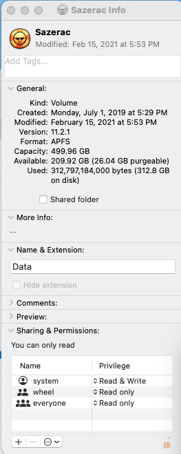 I cannot seem to write (or create new folders/docs) to the Finder Sazerac, but only to the System-level Sazerac. Doing a Get Info on my System-level Sazerac, it tells me that I don’t have permission to make system-level changes, such as trying to move my Docs folder to the Finder drive image. When I try to add myself as an administrator, though I have my password to add applications and make other changes, it tells me I don’t have the necessary permission.