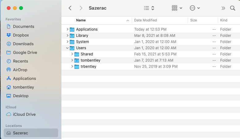 I updated from Mojave to Big Sur and though I’ve used Macs for a long time, I’m not that technical. Post upgrade, double-clicking on the Finder icon of my hard drive (Sazerac) now only shows the Applications, Library, System and Users folders.