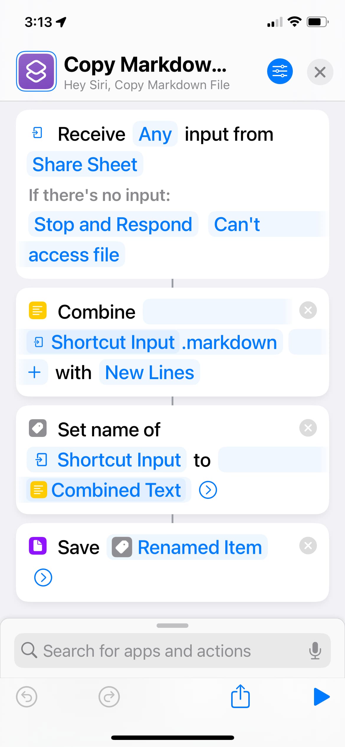What fun! I was looking for a file copy action (couldn’t find) and a concatenation action. I finally found combine. That allowed me to append a .markdown suffix. (I originally tried .txt, but realized I don’t have an app that takes plain textiles as input).