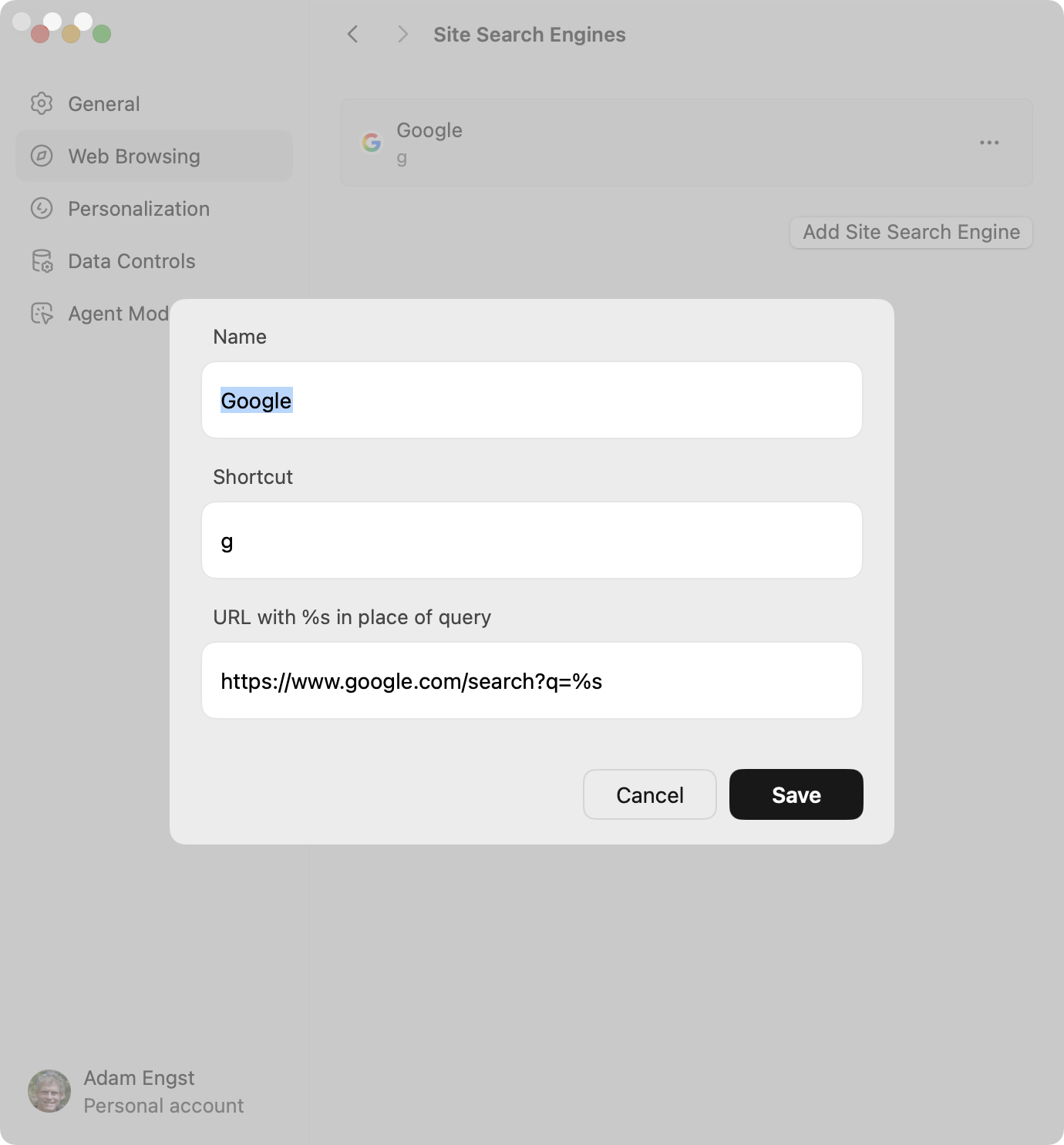 It seems there’s no built-in, selectable way to choose a search engine other than ChatGPT.