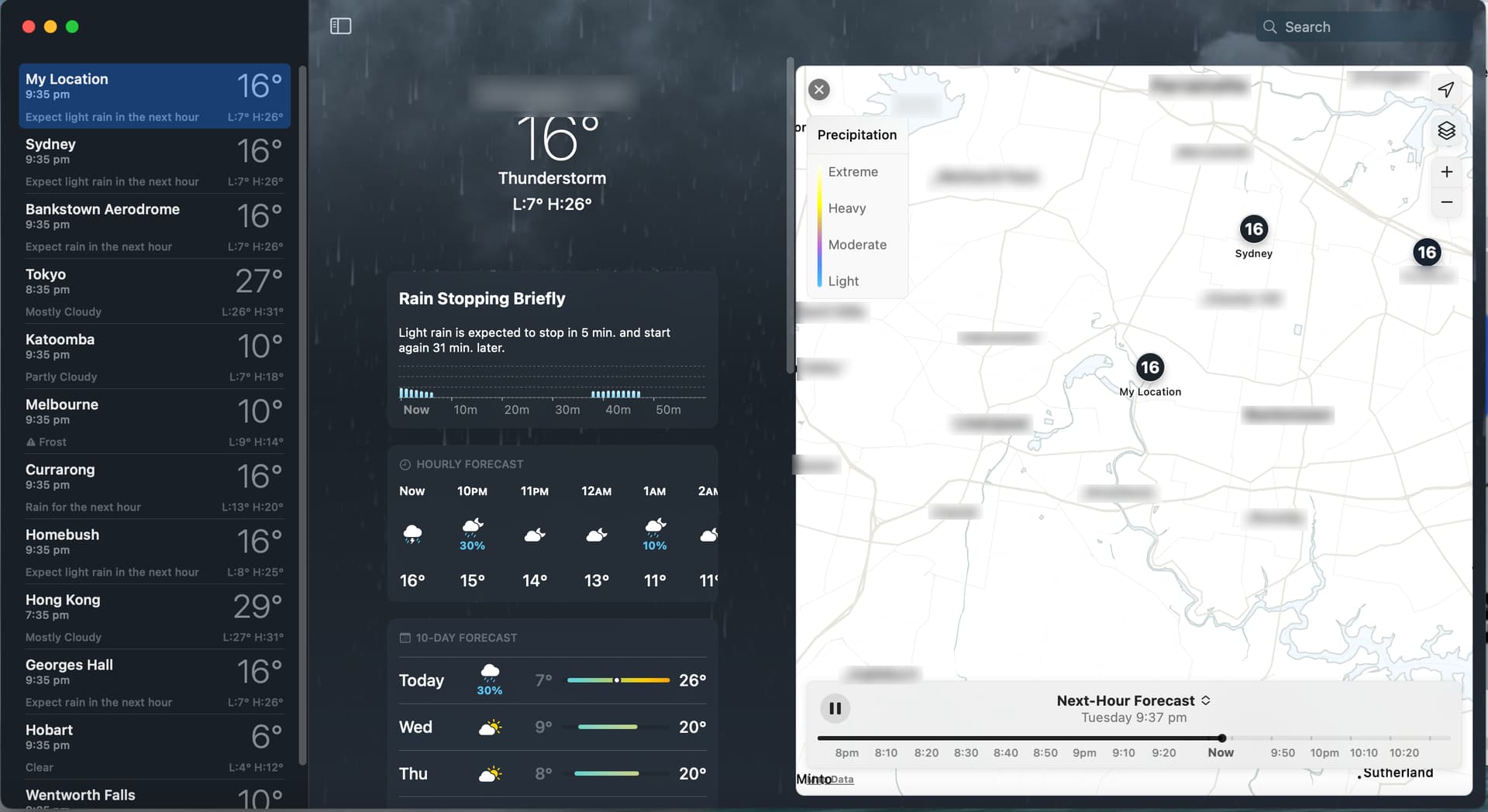 This is why I can’t rely on Apple for radar. This screenshot was taken in the midst of a heavy thunderstorm but Weather’s radar showed no rain anywhere. It seemed to know there was a storm - and Weather often accurately predicts when it’s going to rain (or stop), but its radar is woeful. The BOM website correctly showed the storm and its intensity.