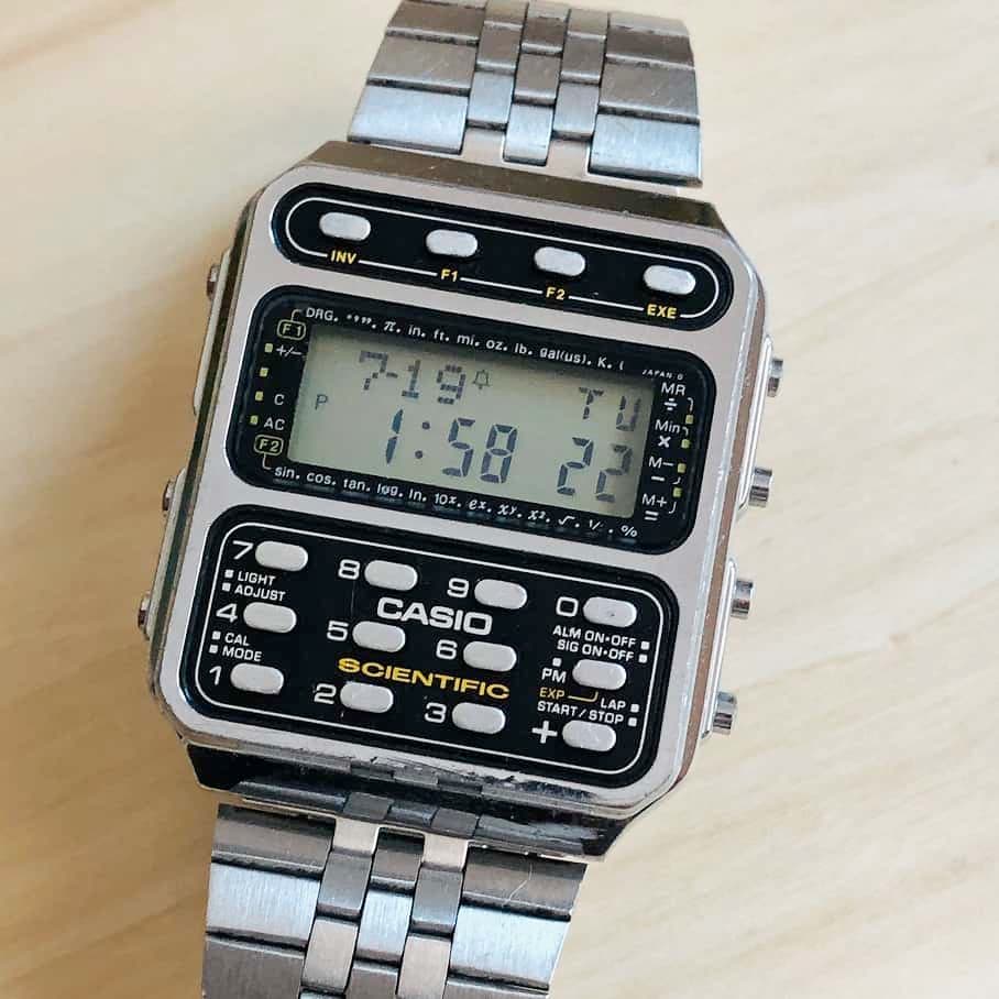 If you look closely you’ll see that this is no ordinary calculator watch. It is a scientific calculator: trigonometry, logarithms, exponents/roots, metric conversions, and more. It does scientific notation. Multiple memories. And more.