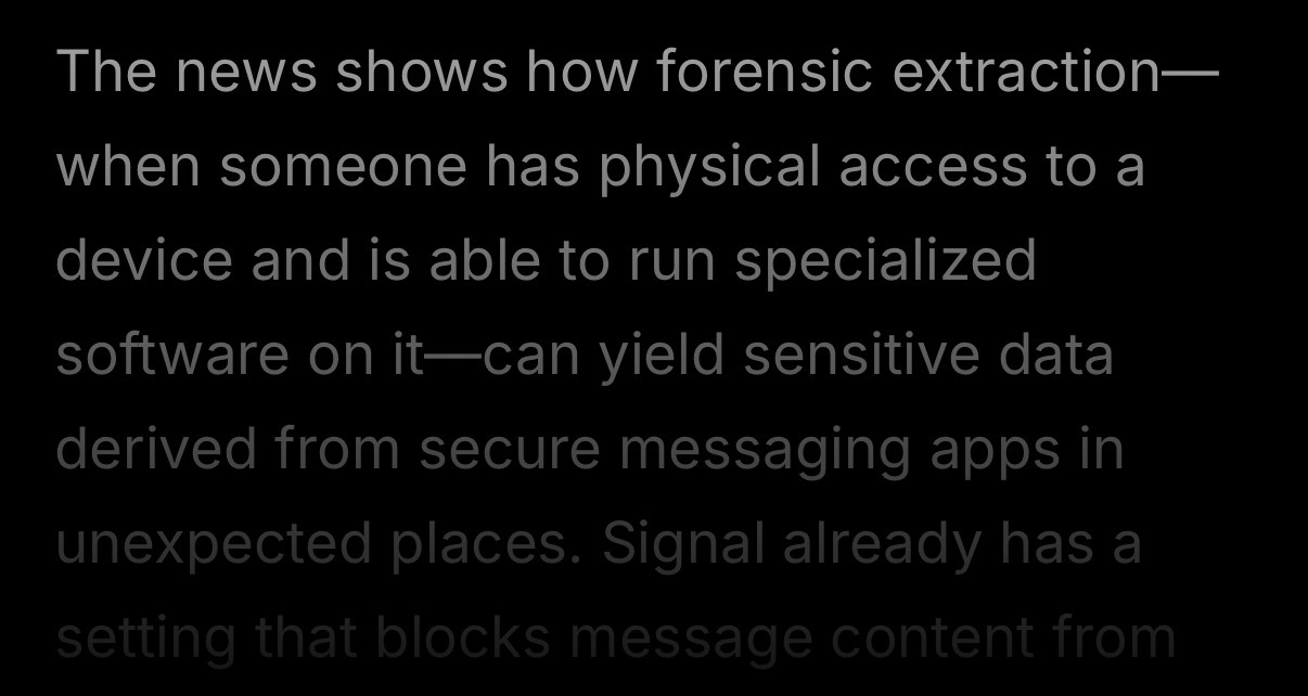 I can’t read the whole article (no subscription) but the excerpt says the device was in possession of the FBI. So this is a level of access and expertise doesn’t throw much shade on Apple. Signal, on the other hand, might need to rethink how they handle notifications.