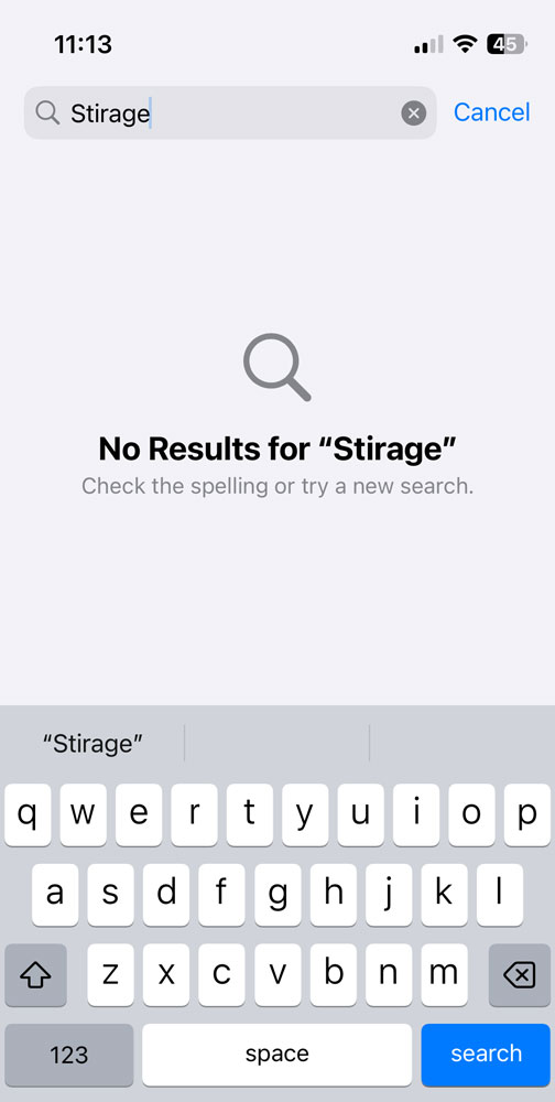 PS. To be fair, maybe I’m quibbling about an interface issue. Of course, I can highlight the word to see suggested spellings, but if the interface can indicate in large, bold type that “No Results for ‘Stirage’” were found, it seems easy enough to ask “Did you mean…” immediately below without requiring the user to know that you can highlight the misspelled word to see suggestions.