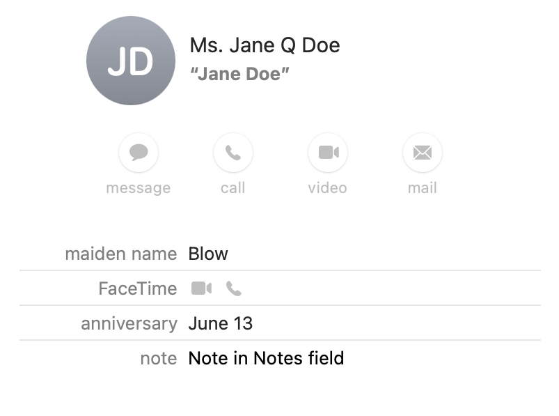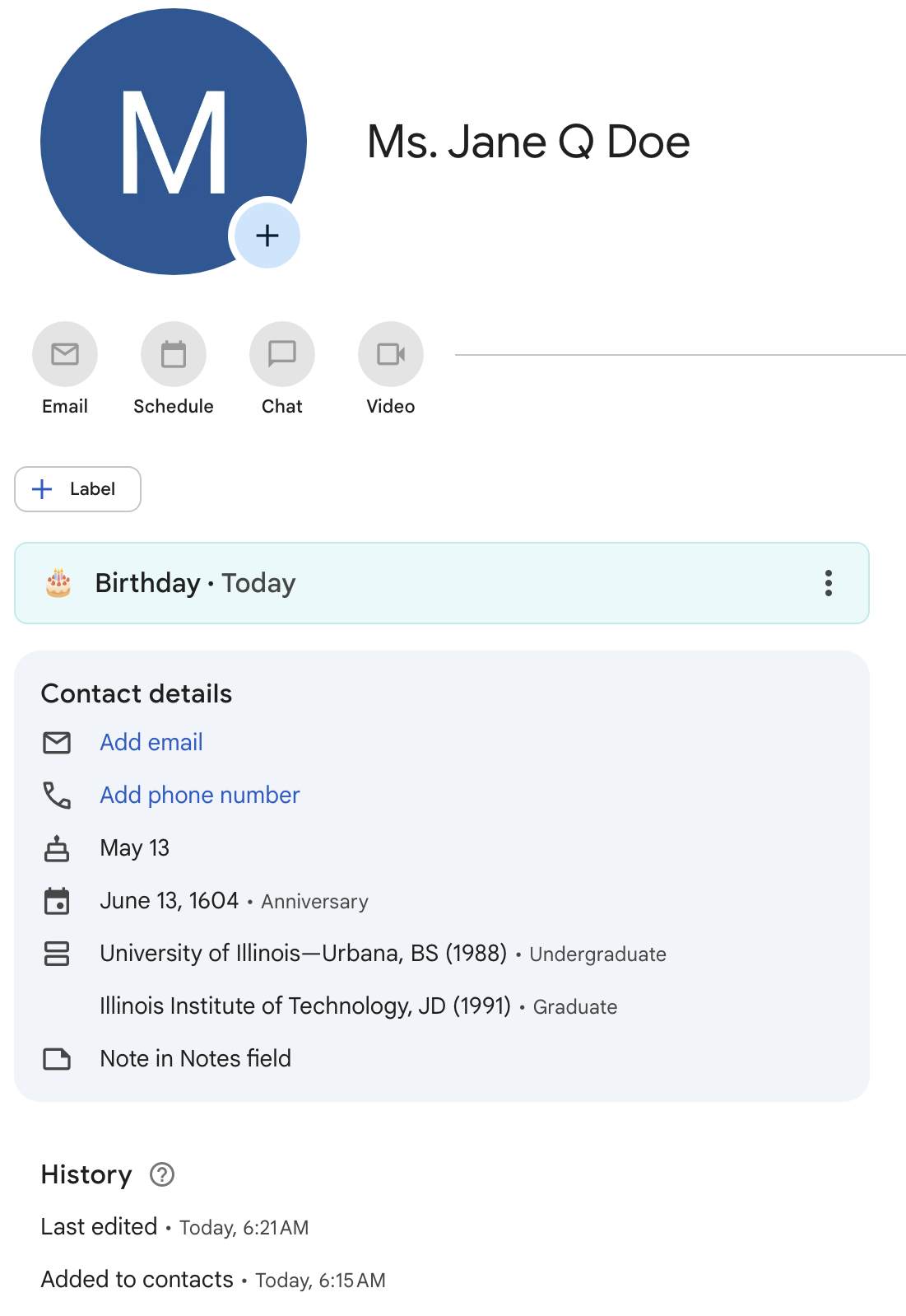 I started by creating a Google Contact contact for Jane Q Doe with a
