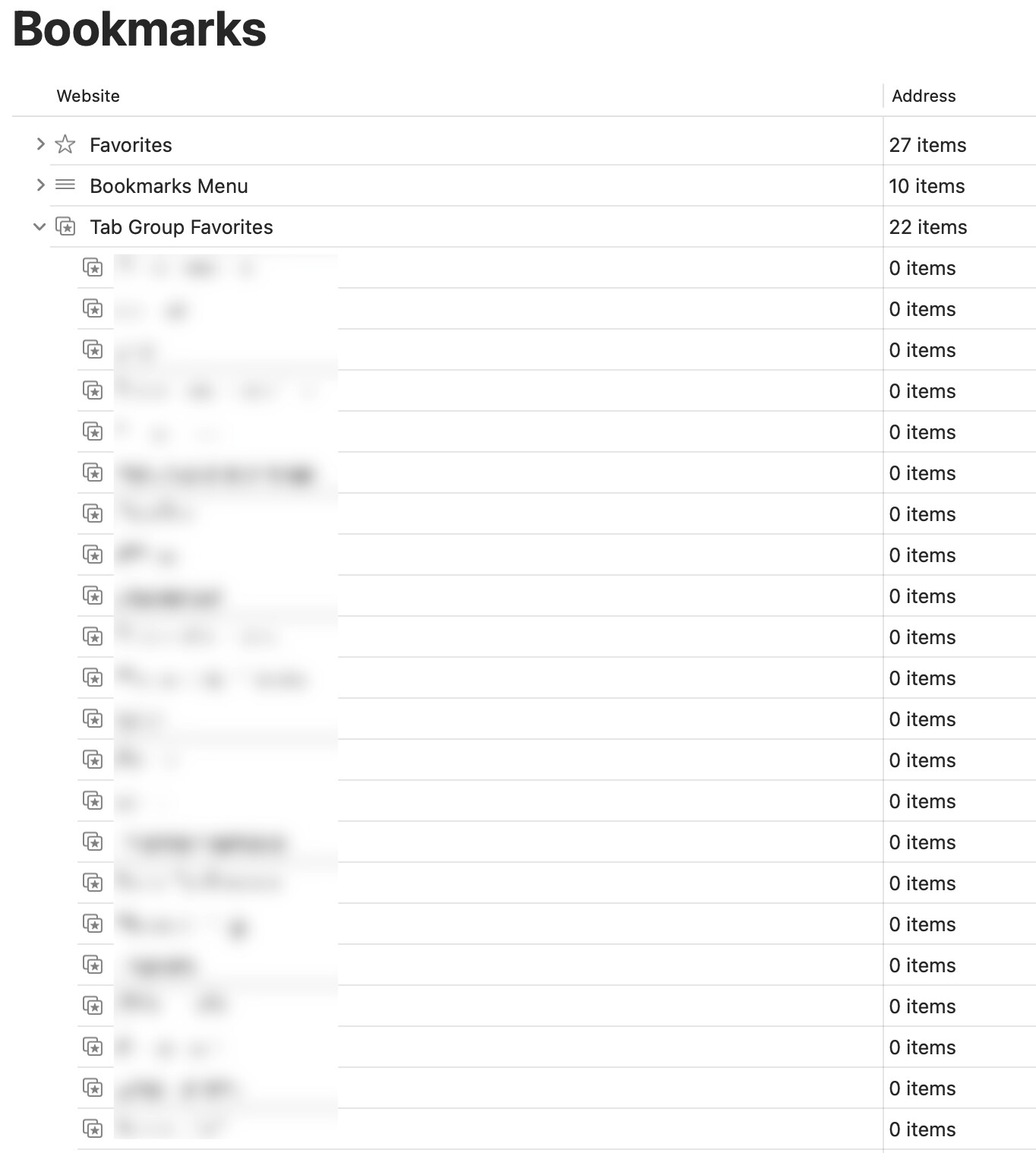 Has anyone else had this problem? Any solutions? All of the regular bookmarks (Favorites and Bookmarks Menu) are still there, it’s just the Tab Group Favorites that was wiped of bookmarks.
