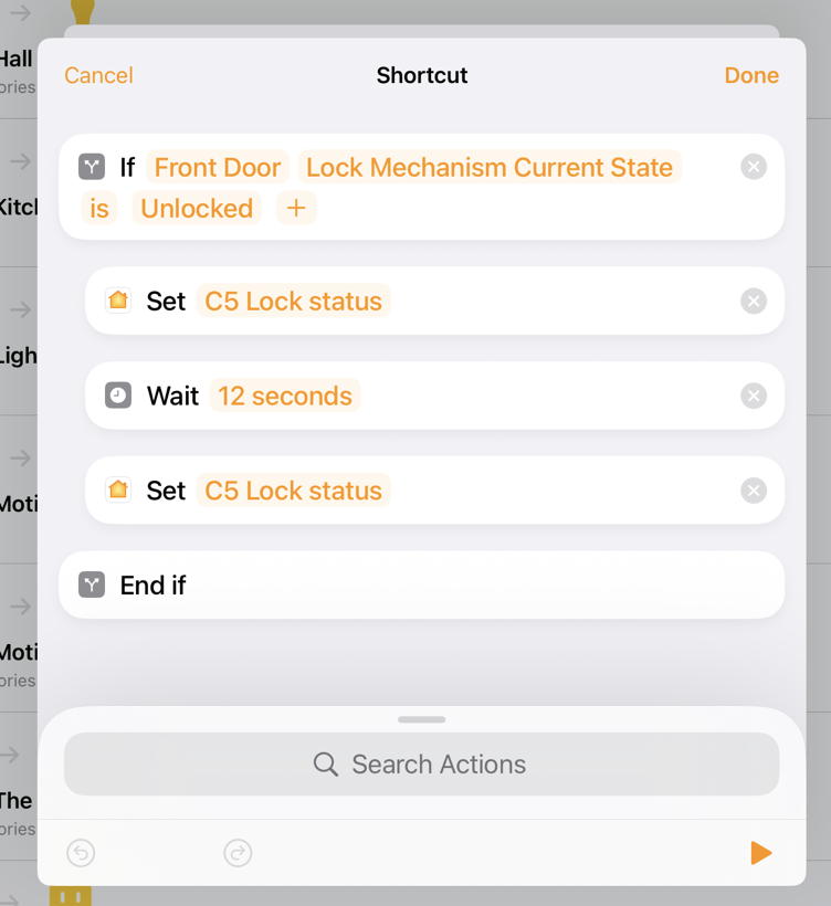 4 The shortcut tests if the door is locked. If not it turns the power outlet on for 20 seconds (Status “on”, wait 20s, *Status “off”)), which is enough to trigger the Pushcut notification