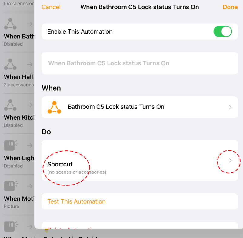 2 Next create a Home Automation that monitors an accessory. In my case I am using an unused power outlet called “C5 Lock Status”.
