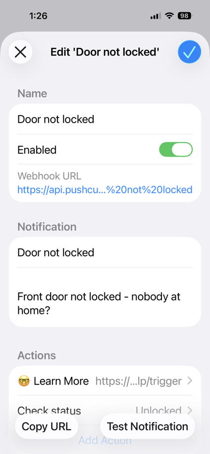 1 Create a new notification in Pushcut. This generates a unique URL for use in the Home automation. Copy the URL.