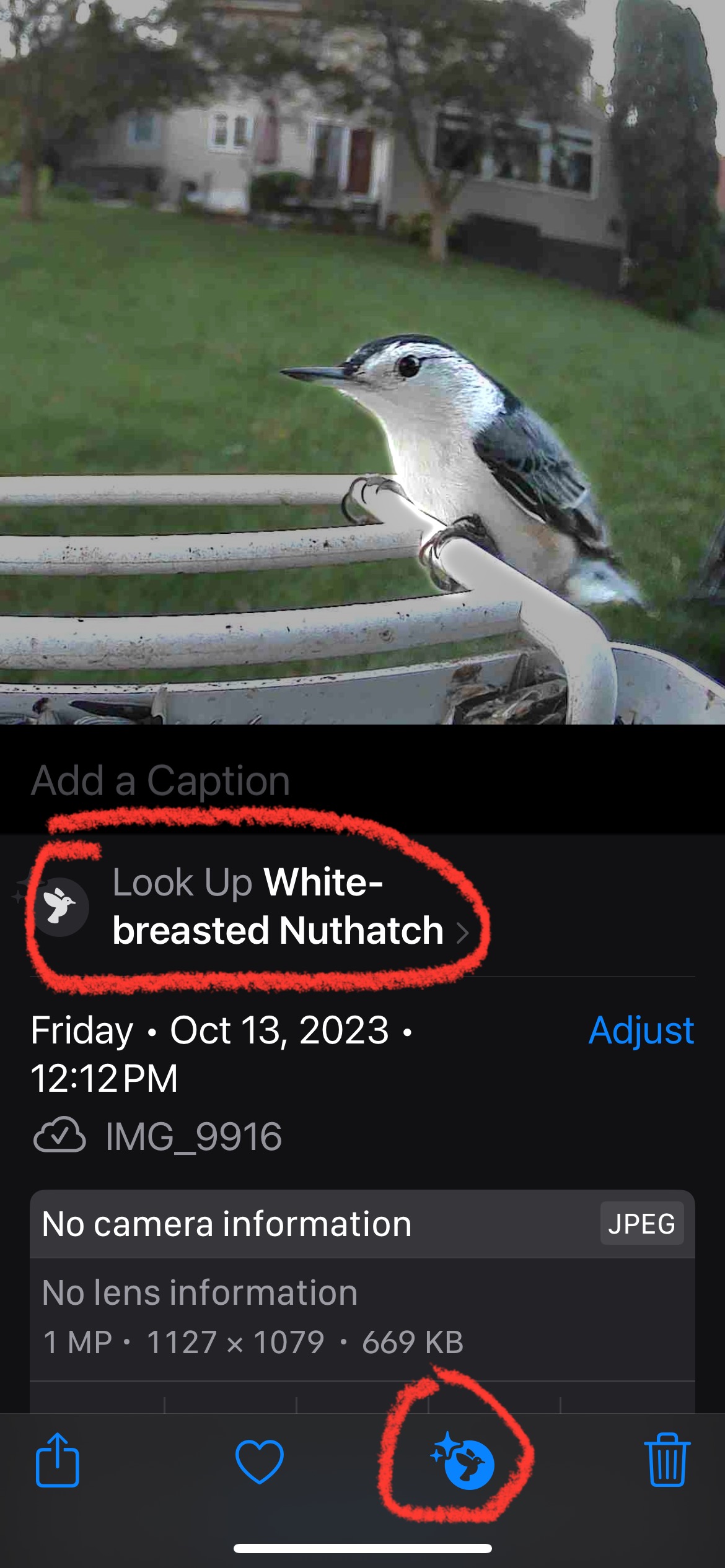 Before, the (i) icon at the bottom just got a generic star to indicate “something” was identified. Now we can see it’s a bird.