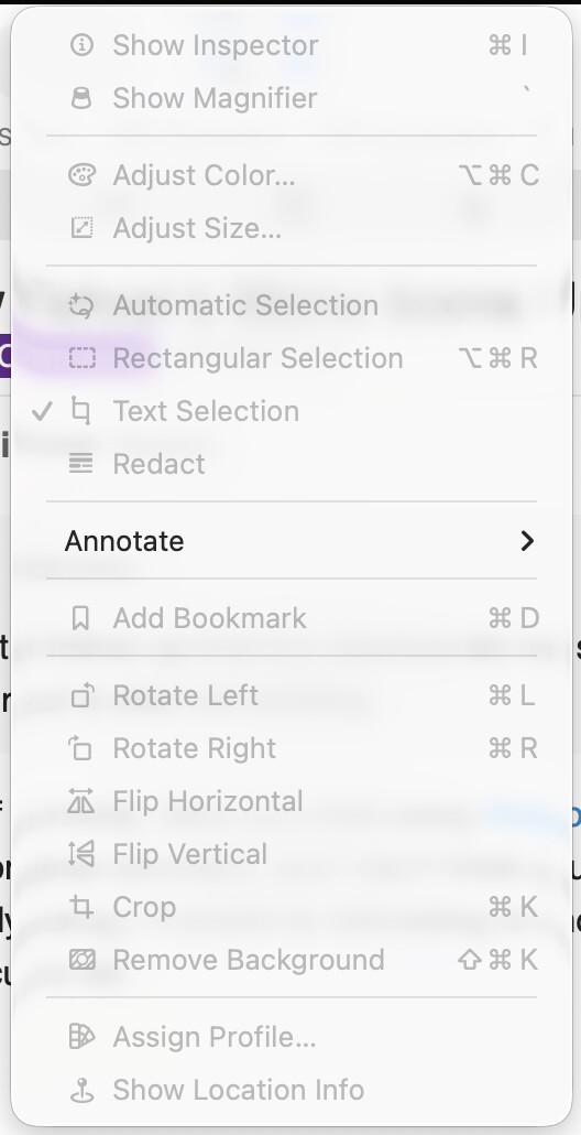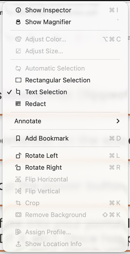 Here is the weird thing - if I open Preview without a document open, the shortcut shows in the menu next to “Rectangular Selection” (grayed out, of course).
