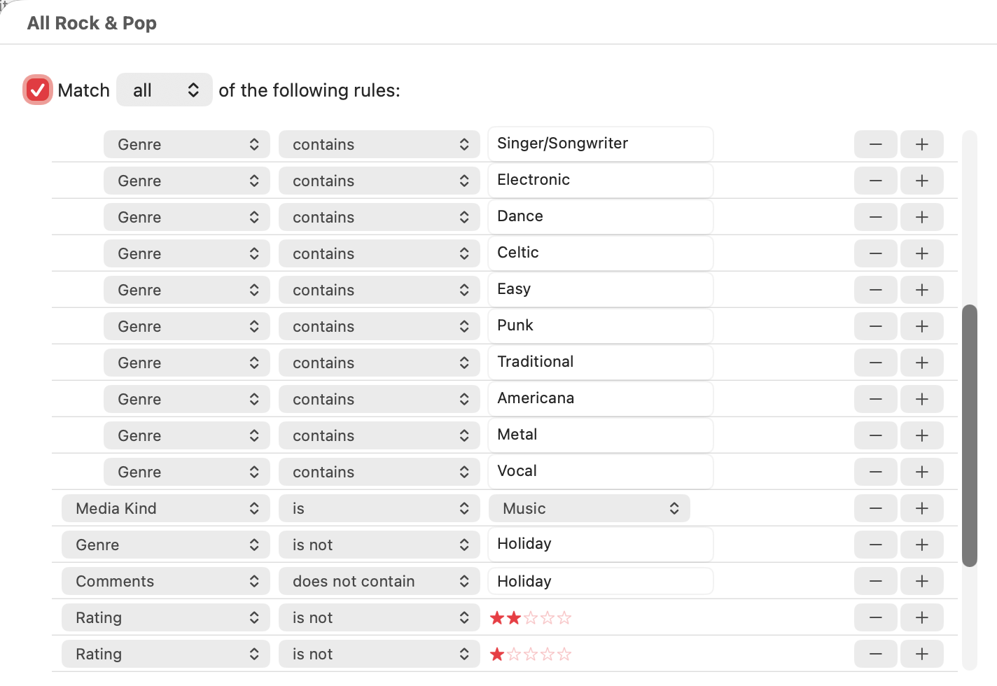 Finally, I rolled up my sleeves and started poking at the playlist in the Music app on my Mac. Thinking that the source of the songs might be related, I created a version of the playlist that included only Apple Music tracks, excluding those purchased from the iTunes Store. No change. I then tried creating new playlists from small subsets of the main playlist, but clicking Shuffle didn’t play anything from those playlists. Grasping at straws, I created a smart playlist that collected songs by genre and album title. Despite having 70 artists in the playlist, all the songs that appeared in the Up Next queue from shuffling came from fewer than 10. Then I remembered that the Music app has an option to ignore unchecked songs, so I turned on Music > Settings > General > Songs List Checkboxes, but it only showed everything as checked.