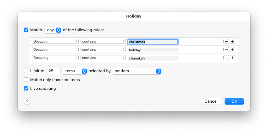 Once Thanksgiving is over, Tonya and I like to play holiday music from an extensive playlist we’ve built up over the years. However, getting that playlist working this year proved intensely frustrating. Even though it contains over 300 songs, only a handful played when we asked Siri to shuffle the playlist on the HomePod. It made no sense—I could cause any song in the playlist to play on the HomePod from my iPhone, and the Music app had no problem continuing from one song to another as long as shuffle wasn’t turned on. Other playlists worked fine, but there was no apparent difference between them and the holiday playlist. Nor could I get the playlist to shuffle on my iPhone or Mac.
