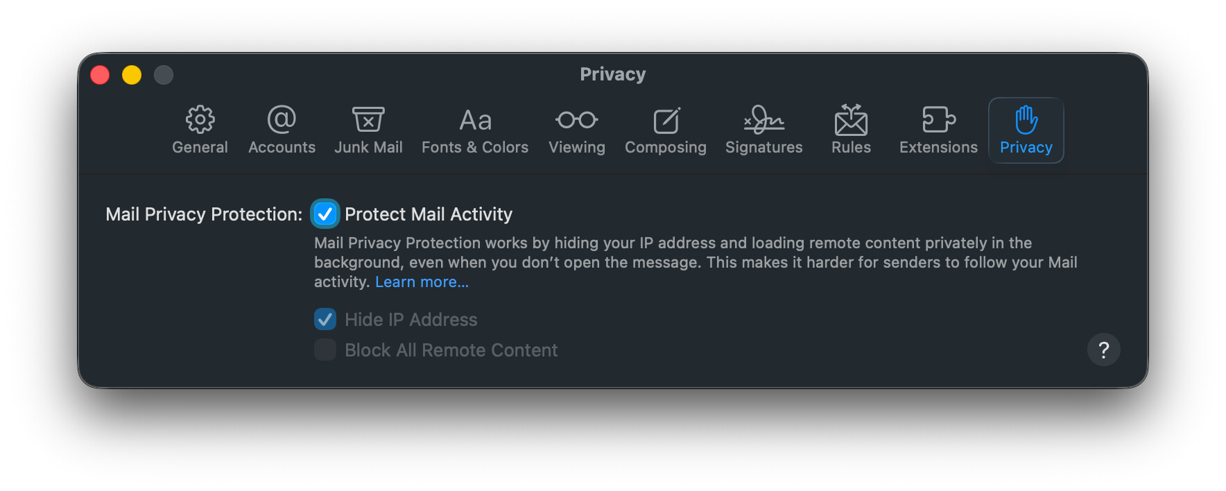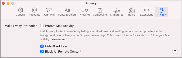 On my macOS 15 Sequoia system Mail hides remote content in email messages and provides the Load Remote Content button. The privacy settings are: Protect Mail Activity off, and Block All Remote Content active.