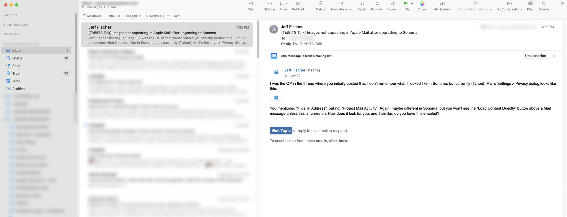 I know this deals with the TidBITS graphics but I began having a problem w images in Mac Mail after upgrading from Ventura to Sonoma. I experience it with and without Hide IP Address and with and without Private Relay. My one big question is I don’t even see a Load Content button on the Mail at the top bar? I’ve tried rebooting after adjusting those privacy settings and rebuilding mailboxes. I was hoping at least to use the Load Content button on a case by case basis but it doesn’t show up? I usually have issues w my After Effects plugins after an upgrade but that went smoothly and ended up with this mess! Thanks for any help you can offer! (I’m on a M2 MacStudio running Sonoma 14.8.3)