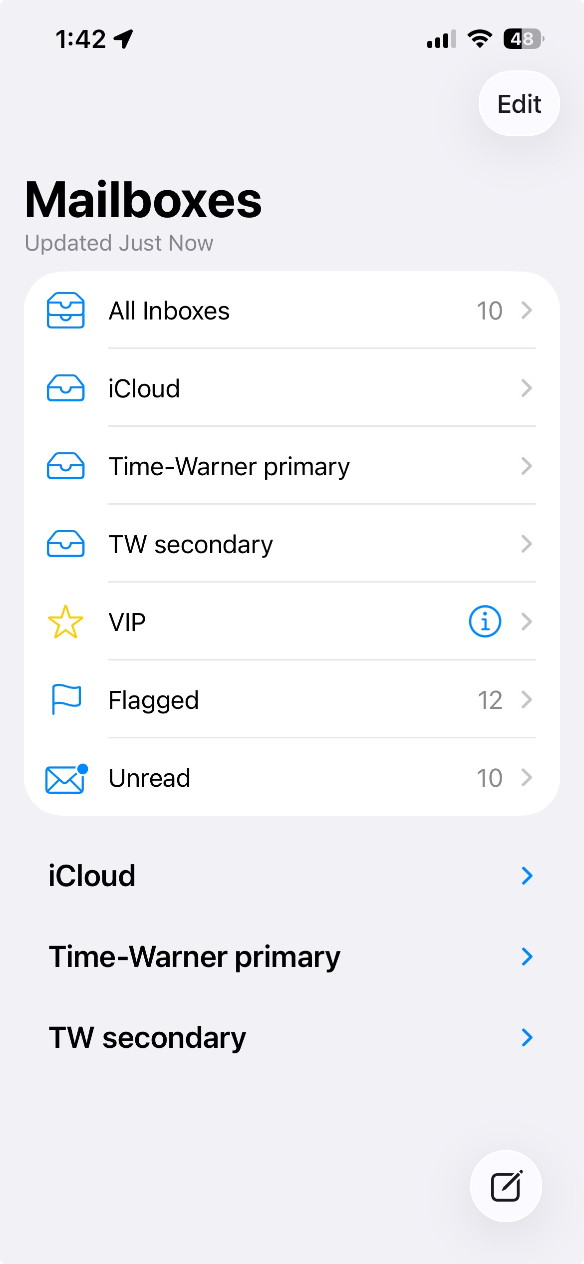 I don’t have any Apple-related mail addresses that I know of. I have iOS Mail set to List view of mail from “All Inboxes.” If I open > for my primary email address, all I see are the default mail folders, none of the folders I have created.When I open Mail on the desktop, all the mailboxes are in “On my Mac”. On the iPhone, I simply see my default mail accounts and the iCloud account. Looks like this: