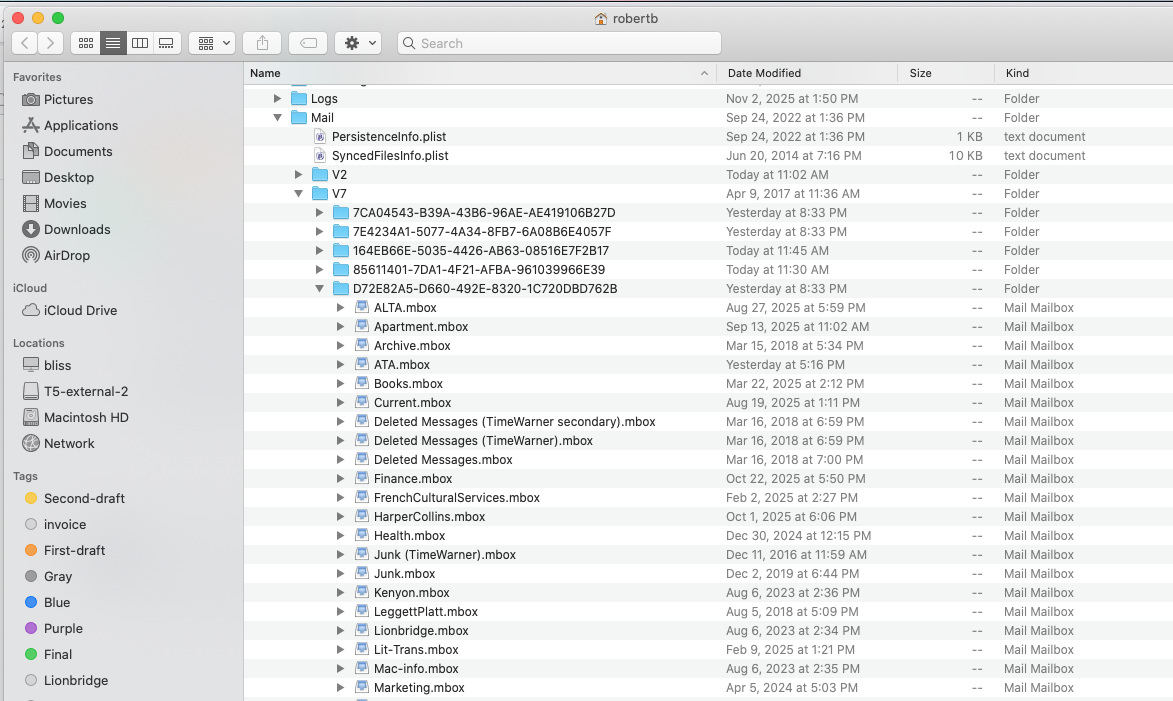 You also need to stop doing stuff in the Mail folder inside the Library folder on your iMac. That can only lead to disaster, which is why Apple hides that Library folder by default. Everything should be done in Mail.