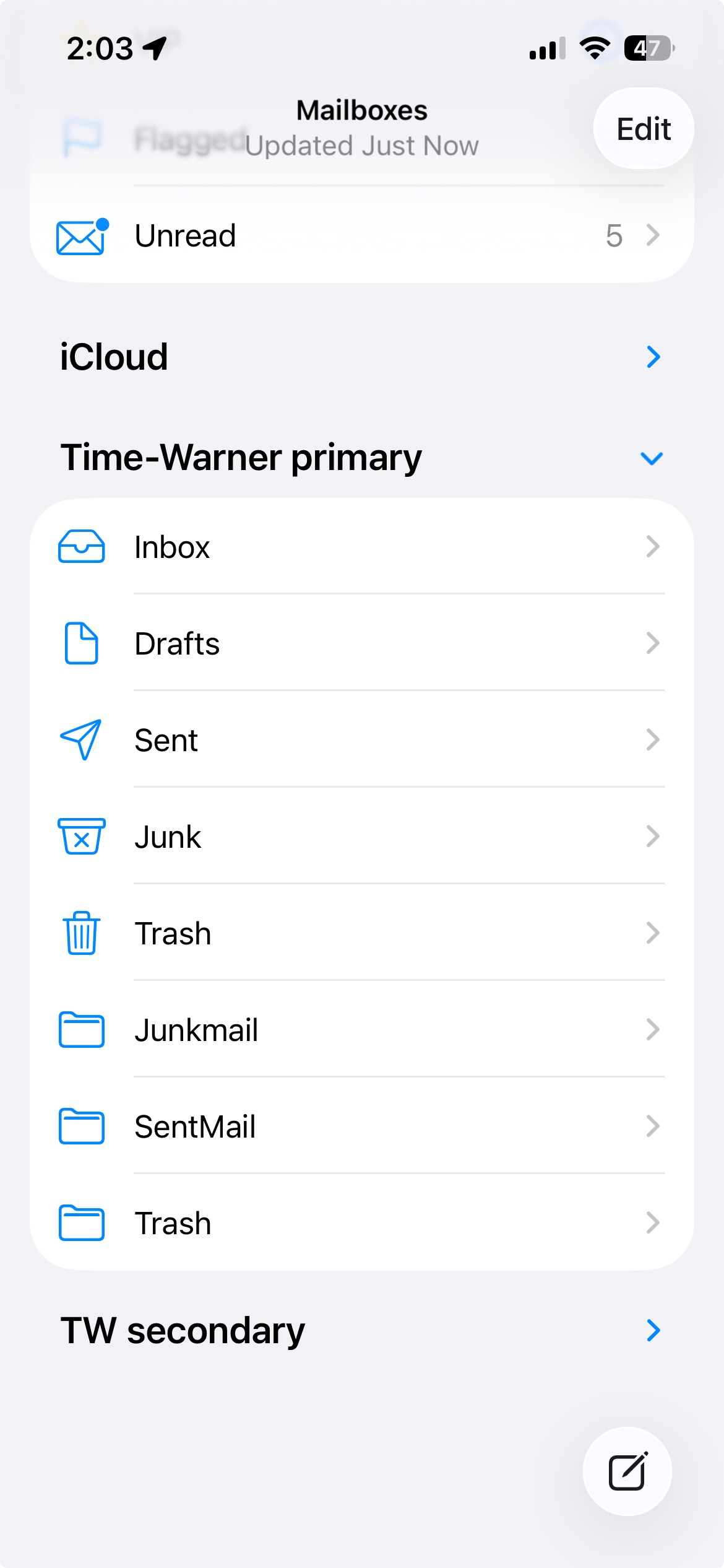 So that’s your problem. Your iPhone cannot see mailboxes that are ‘On Your Mac.’ It can only see mailboxes in the Cloud. You need to have your mailboxes in your Time Warner primary account, not on your Mac.