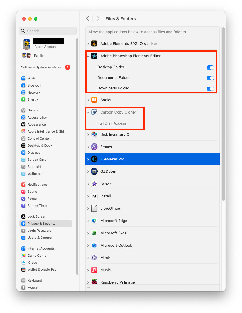 And then there’s the Full Disk Access category, which overrides all of the above. But that should generally only be needed for utilities that legitimately need to access everything. On my system, it has:
