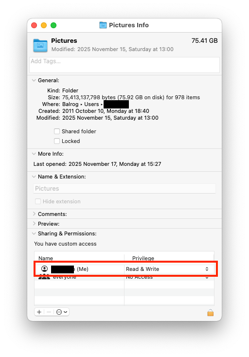 Note that Unix semantics are that if you are the folder’s owner (which should be the case for anything in your home directory unless you’ve configured it otherwise), then you need write access. If you don’t have write access, but your user-group or “everyone” does, that won’t work - the system only checks permissions at the level (user, group or other) that most-precisely matches your login.