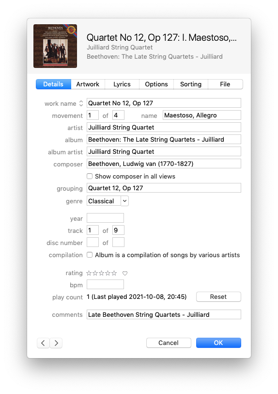 For many years (late 80s up), I did my own metadata in Filemaker, but it was by album, not tracks. Eventually it got too time consuming to keep up even with the album schema so my database never got converted to a track based system. Then I subscribed to emusic and had to throw in the towel. When I started using iTunes (couldn’t find anything I liked better and still can’t) I just made sure that the album field was correct, set albums (and some tracks) to sensible genres, turned off compilations for everything, and added my CD index number to the Description field so I can easily find the album notes. Every now and then I’ll do some fixing, such as moving composer from an album title to the composer field, but as I get older, I don’t care as much–time flits by too fast, and it’s uncommon to not be able to find something fairly quickly.