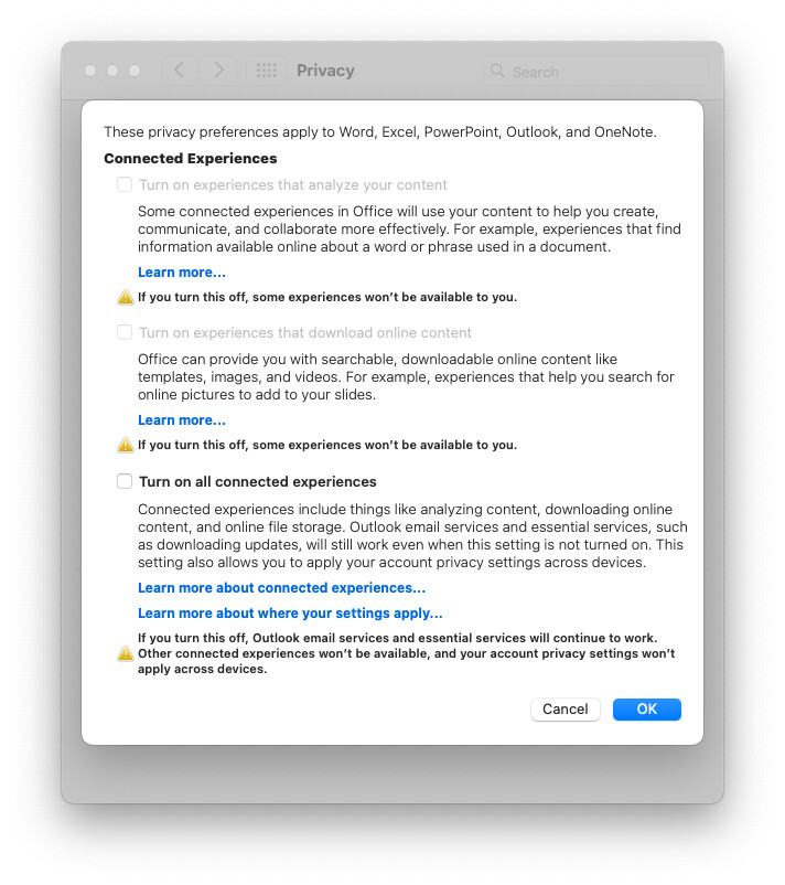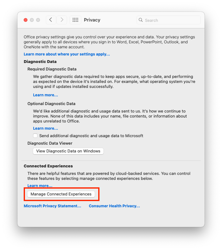 I found that if you had “Connected Experiences” disabled when Microsoft introduced Copilot, then its icons were not added to the app’s ribbon and settings. You can check them by going to Settings → Privacy, then click on “Manage Connected Experiences”: