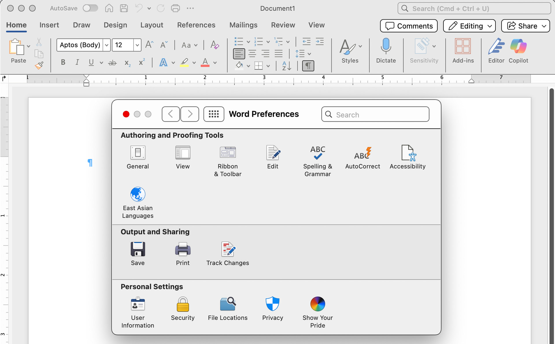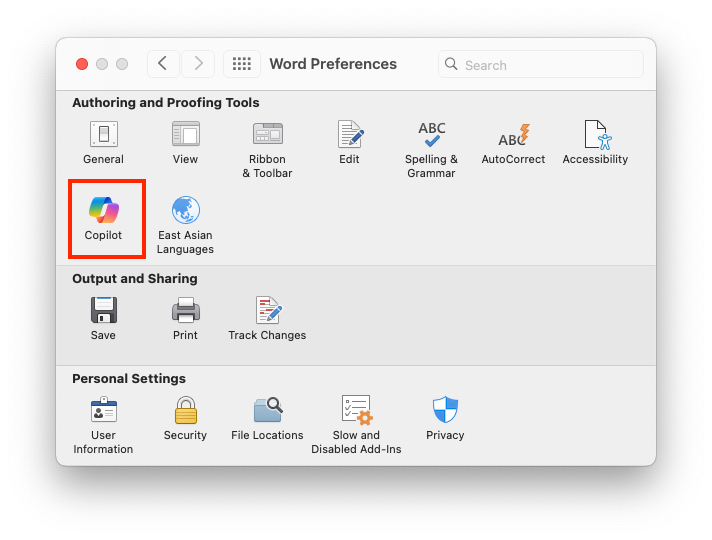 Here’s a screenshot from Word showing the Ribbon with Copilot and Preferences without a Copilot icon.