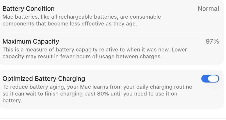 Anyway, a few days after upgrading to Mac OS 26.01 my MBP M1 from 2021 remains plugged in for about 18 months now - since my last U.S. trip. Looking at the battery settings it shows “on hold - 80%” which is what it shows most of the time.