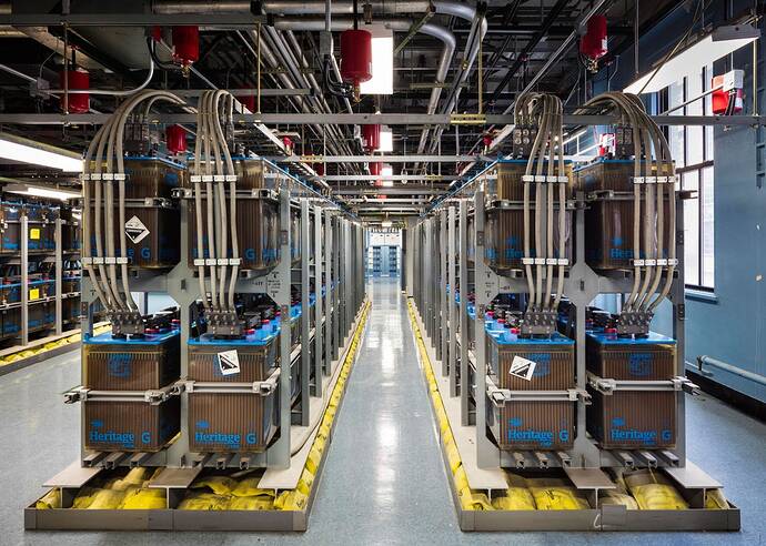 Each cell of the huge battery I mention is about the dimensions of a 20-25-gallon cylinder. Each cell is of the flooded, lead acid type. Depending on the size of the Central Office and its switching equipment, the battery room can be VERY large, housing hundreds of such cells.