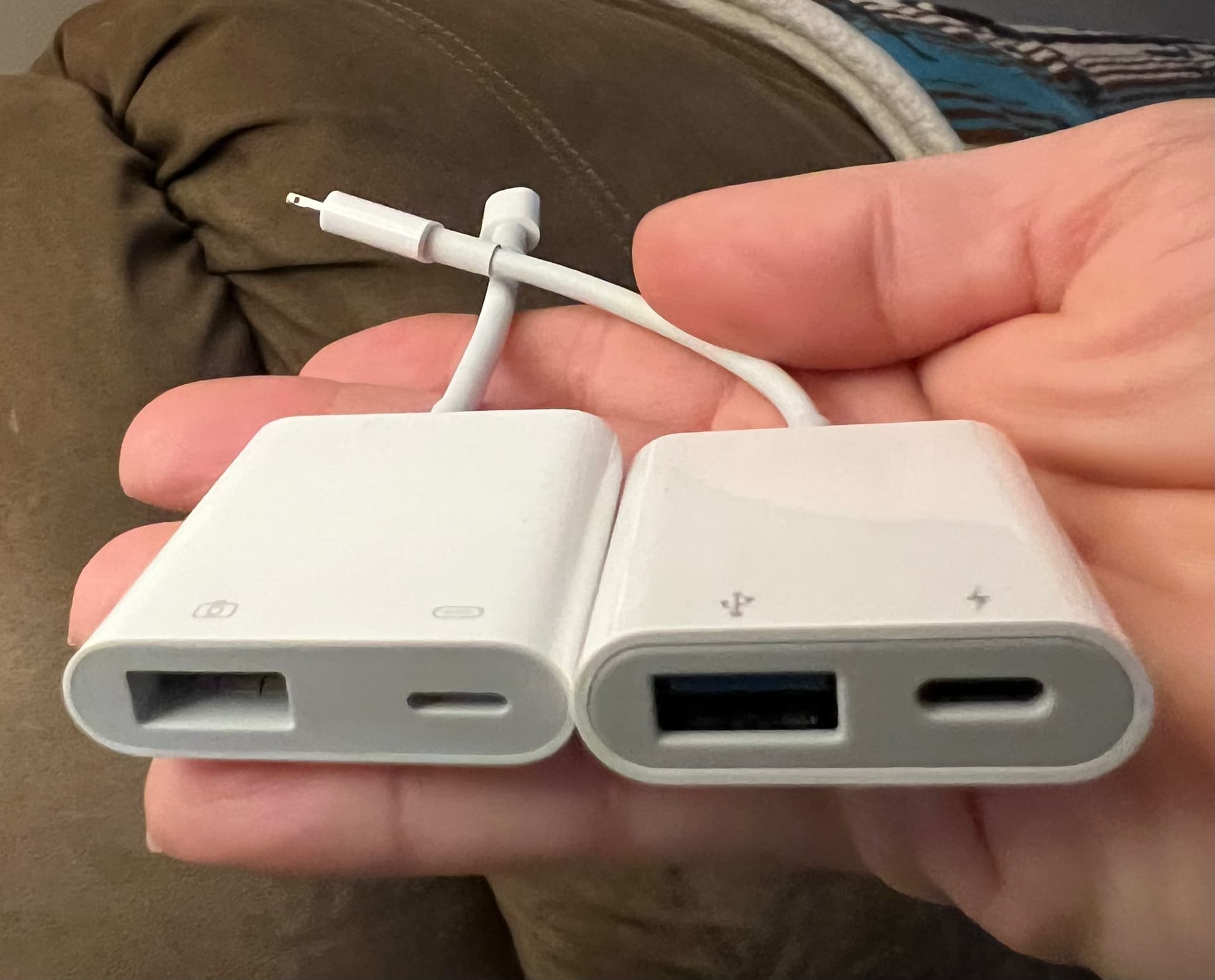 I reached out to Apple, and they recommended “OTG” (on-the-go) USB cables. The more I learn about USB, the more complicated and therefore annoying it gets. It seems OTG cables are not just “cables” but have smarts that allow one device to act as the “host”. Alas, the “smarts” also means there are countless compatibility and performance risks…