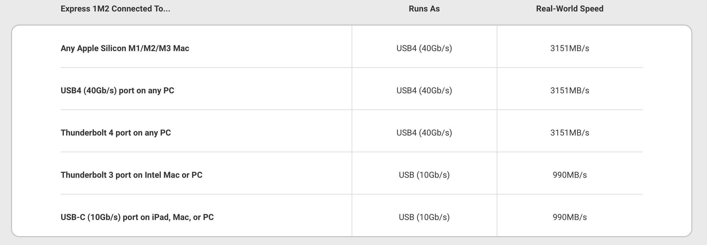 Not many manufacturers are that forthcoming and instead label things as if it’s clear that if it works with TB4, it will also work with TB3. While that is technically true (or close enough), the real question is how well it works. For somebody with a 2020 Intel Mac and TB3 ports, this tells them that rather than spend $95 on this enclosure, they could get the same throughput with a $15 USB3 enclosure (not saying there aren’t other benefits to TB - there clearly are).
