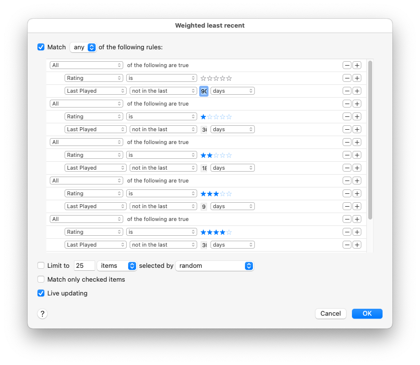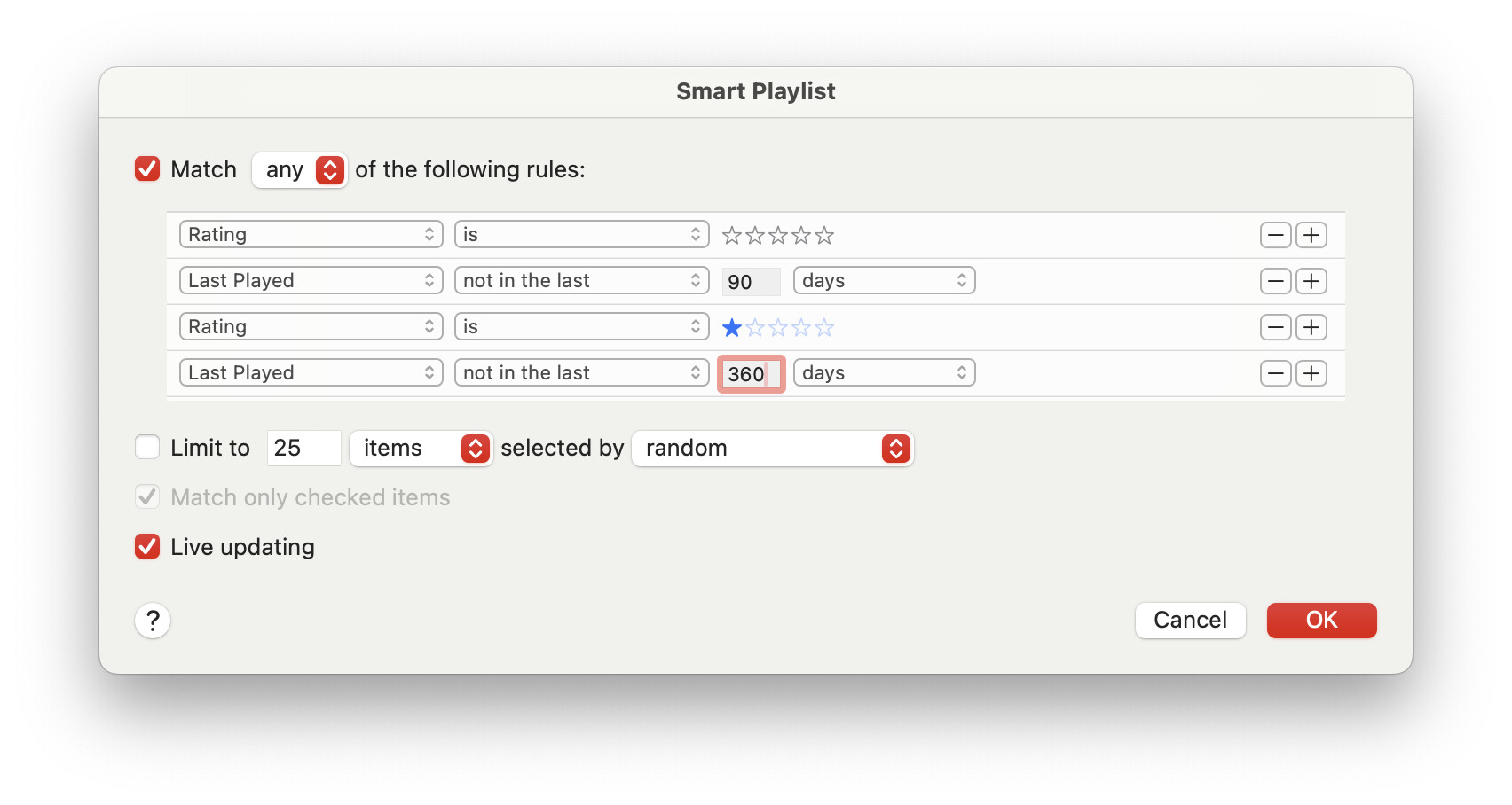 @Shamino I like your smart playlist idea, but I can’t figure out how to make a playlist that in the form of ANY OF (condition a AND condition b) OR (condition x AND condition y).