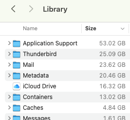 In my case the user’s Library is 160GB with only six folders exceeding 10GB each: