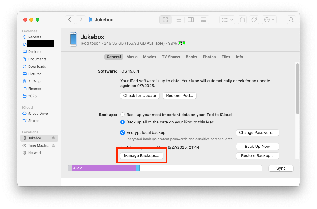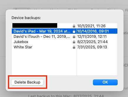 From there’s you’ll see all your device backups, including the date they were created. You can delete any one you want to be rid of (e.g. for devices you no longer own or archival backups you no longer care about):