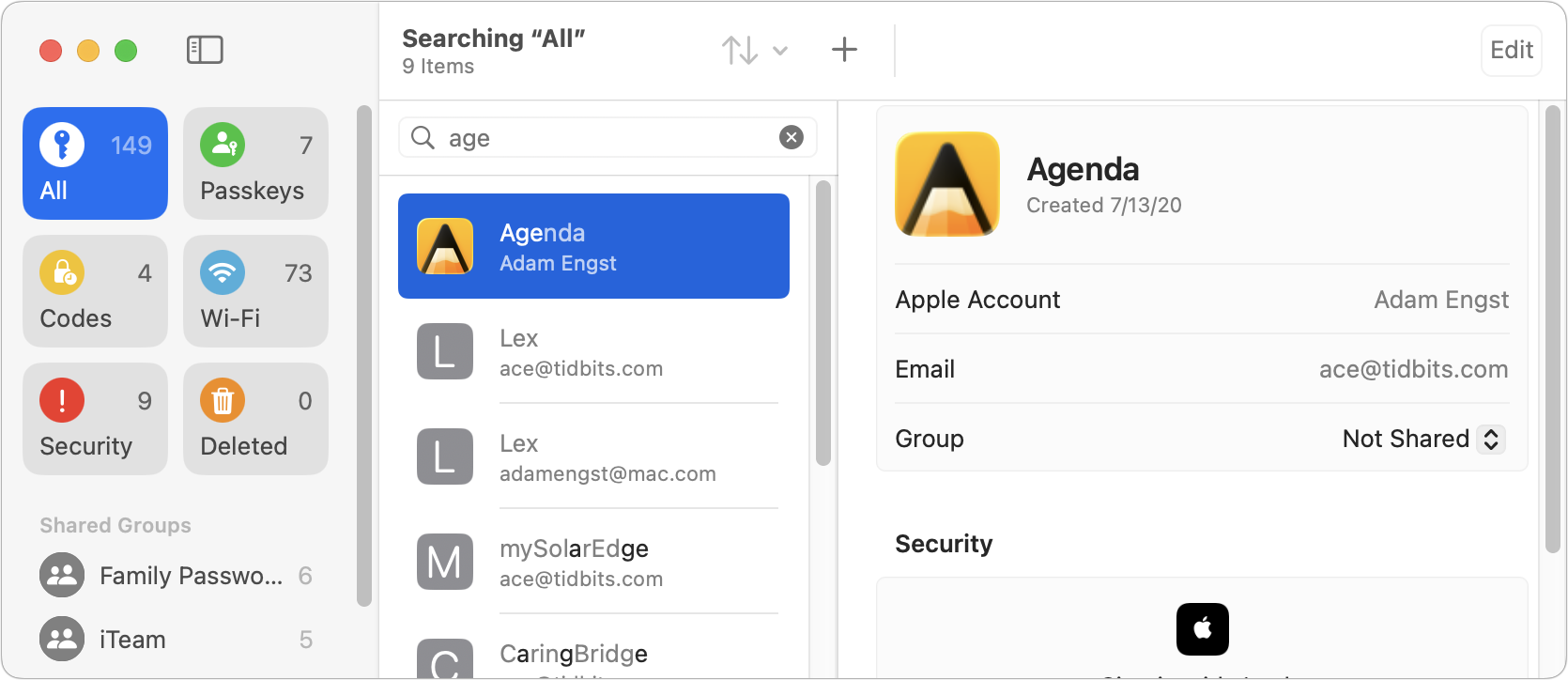 In fact, the Passwords search is sort of interesting. As I type, the search list becomes shorter and shorter, but it’s clearly matching on non-contiguous characters, as you say. But it is keeping the most likely hits at the top. I typed “age” and it’s matching Agenda first, which is absolutely right, and although it may seem weird for Lex to be second, it’s because the URL is lex.page, so it’s a strong match on “age”. Matching on mySolarEdge and CaringBridge is a little silly, but they’re farther down in the list, and if I continue typing, the list continues to shrink.