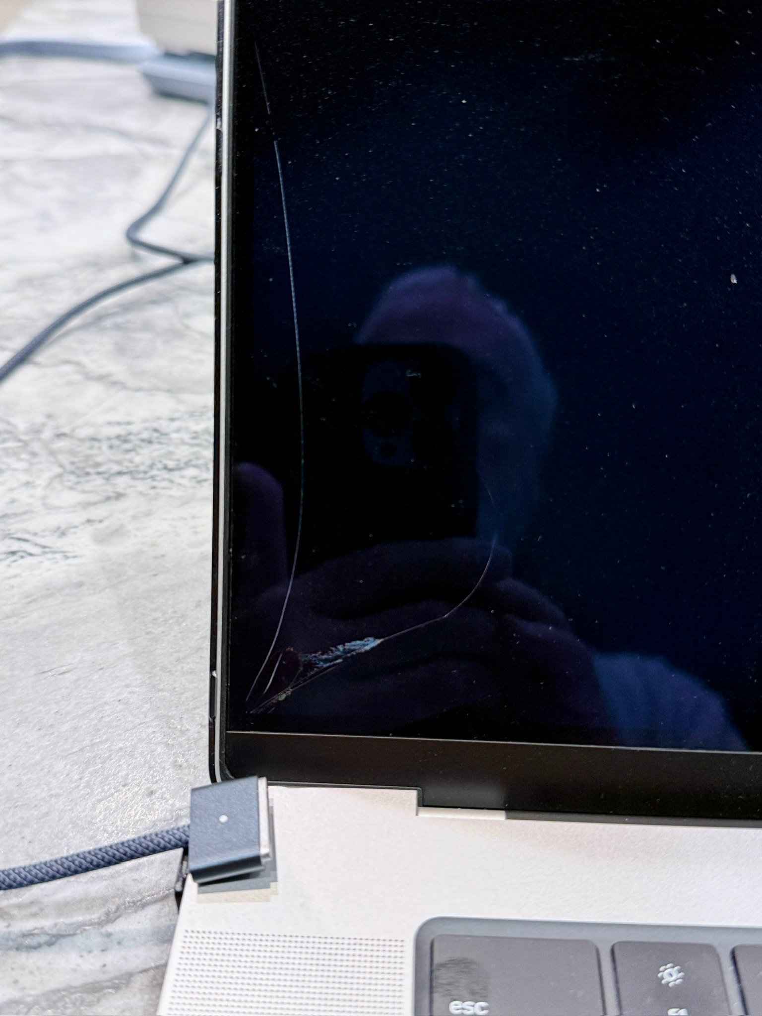I’m not sure how much blame to put on the Incase product, though. I recently served as VP of IT for a company of approximately 100 employees, and I was surprised to see two separate examples of dislodged charging cables cracking screens in exactly this way in the two years I was with the company after never encountering it before. Coincidentally (I think), both machines were 16” MBPs.