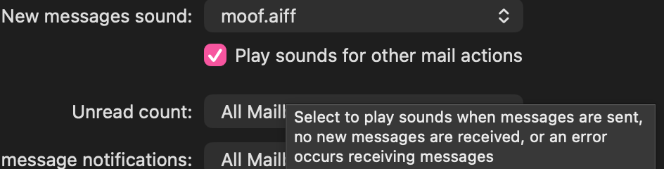 So I thought myself clever and sought an Automator or Shortcuts solution (when email lands in Mail Outbox > Play Sound xyz) but so far haven’t found one.