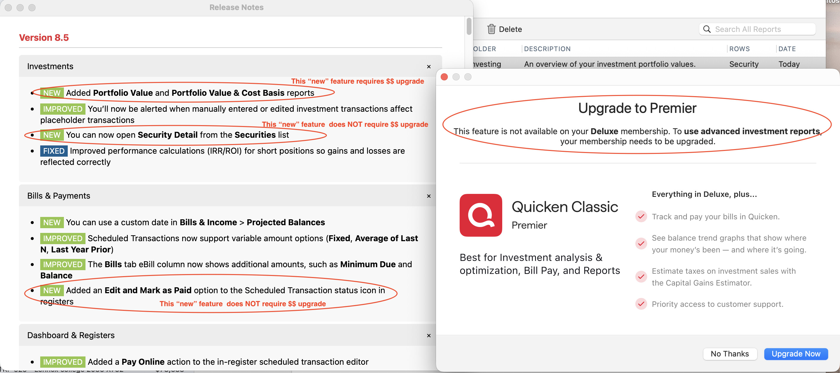 But those two new reports are not, in fact, “added.” Those reports do appear in the list of reports (with no special designation, no asterisk, no $ or anything like that). But when users of their “upgraded” software click on those two reports, a message announces: “This feature is not available on your Deluxe membership. To use advanced investment reports, your membership needs to be upgraded.”