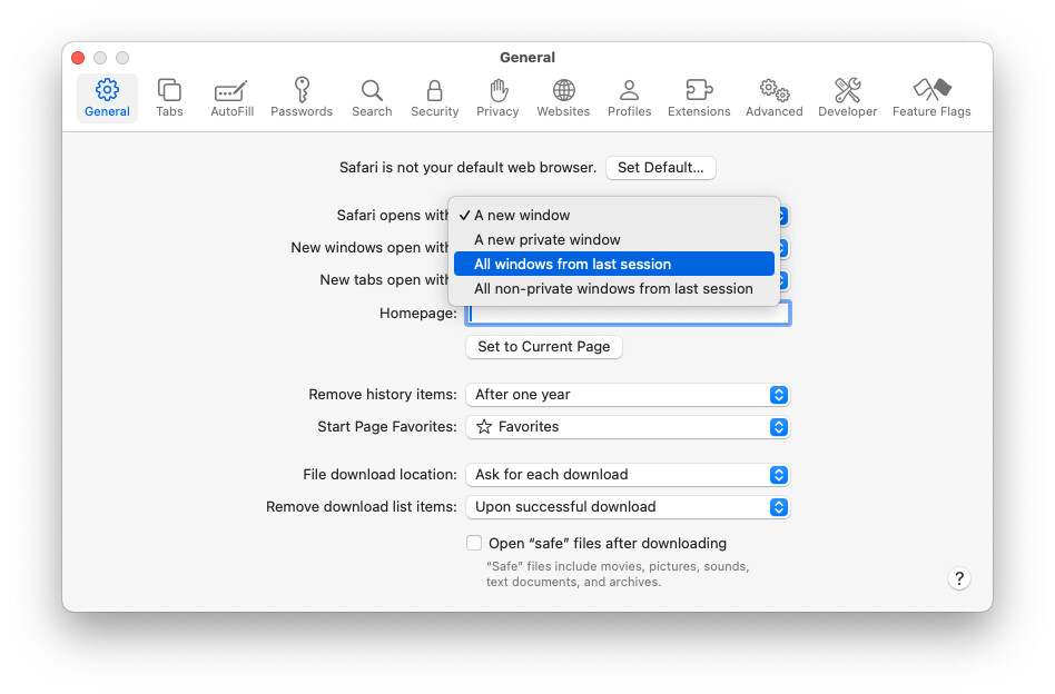 Using OS 26.1 on an iMac. Wondering if I accidentally turned off a setting. All my history seems to be visible, so I can manually recreate what was open last visit by going to prior history, selecting multiple items and double clicking. But inconvenient.