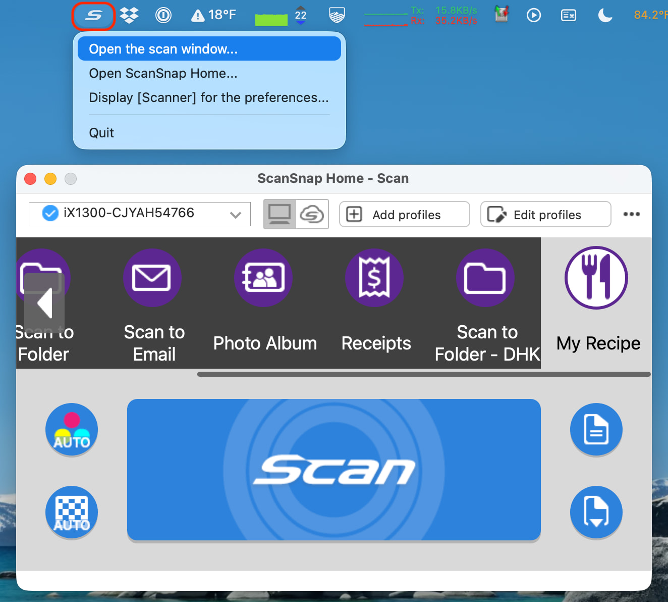No way to put Profiles in the menu? If this is something I’m missing, please show me. The software puts a cute “S” menu, which is handy. But the main interface I need when scanning is to select the profile, which controls the quality, color, duplex, destination, etc. ScanSnap Manager used to make that available via the Dock icon popup. And this new “S” menu would appear to be the perfect place to let you add them; but there doesn’t seem to be any way to do it. Instead, you have to select “Open the scan window…” which reveals the window shown, and then scroll til you find the one you want and select it there.
