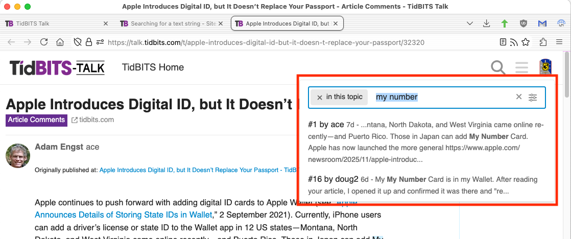 When I search for “digital”, initially Firefox only reports the number of instances in the article, and it will move through them as I click the “next” arrow. But when I click the next arrow while on the last instance of “digital” in the article, Firefox will select the first instance in the comments and adjust the total number of instances.