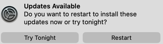 I found this thread (again) because I just got the above message and I was hoping for a clue on how to dismiss it without triggering anything now or later. In general, I prefer to have a choice about when to install any kind of software. In this case, I can see two choices; is there a third?