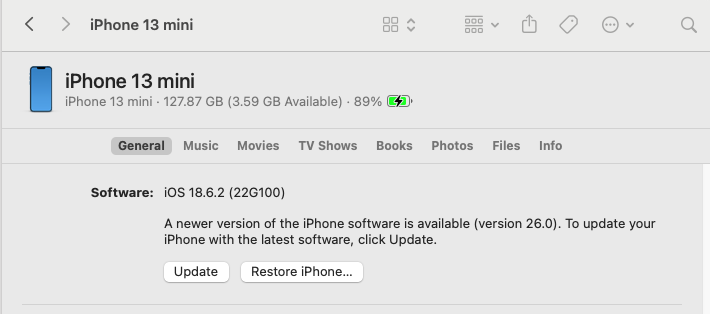 I just did a successful manual backup to the iMac and iTunes reported that the iOS was up-to-date but (not unexpected) there was no offer to “Upgrade to iOS 26” (like the phone offers in General/Software Update)