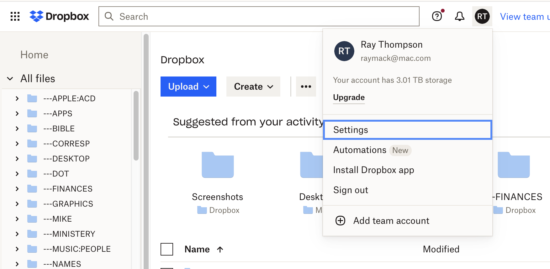 Do you have the Dropbox icon in you menu at the top of the screen of your Mac? You click on it and there will be a menu with a round icon on the far right which may have your initials on it. Click on that to get there