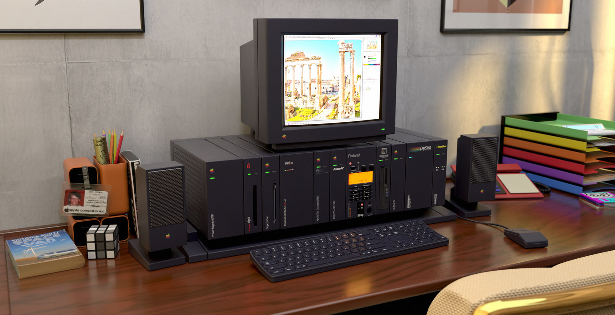 No doubt many here will have encountered the work of Dana Sibera, Australia’s nerdiest pixel-pixie who for thirty years has been creating the Apple machines that we all wanted but Apple weren’t brave enough to make … and yes, that includes a fully-fleshed Jonathan system that might have graced the 90s home office of one Chris Espinosa (that’s his #8 badge hanging from the pen-holder to the left) :