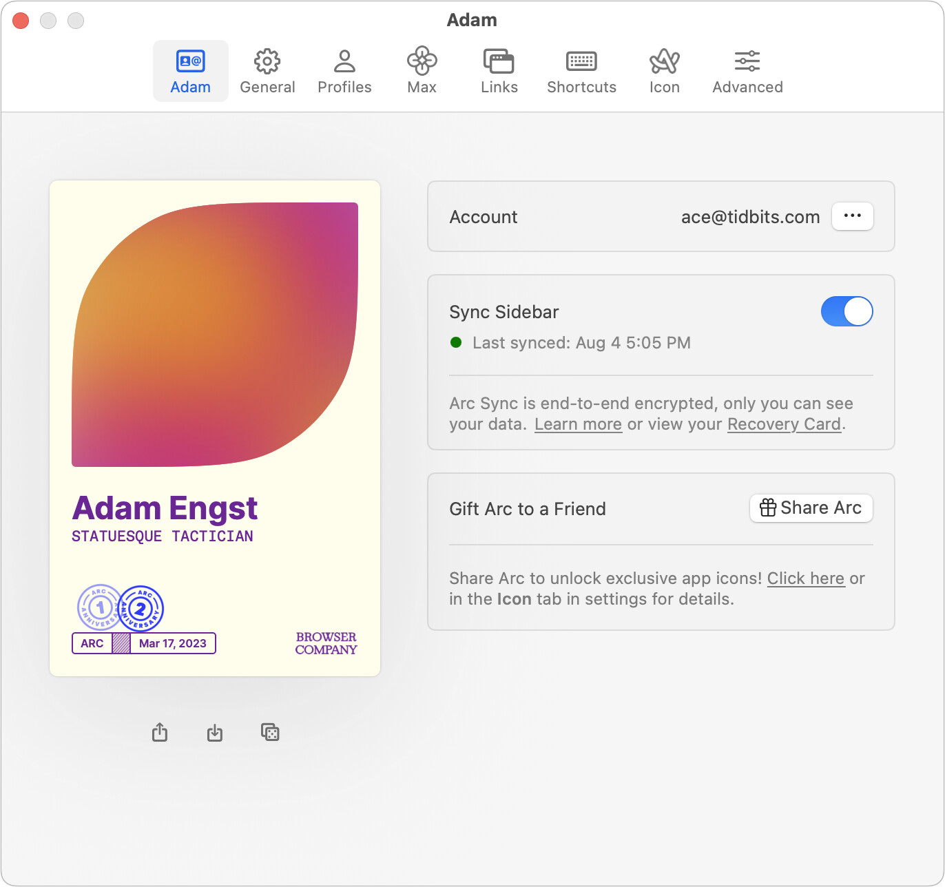 Thanks! I had figured that out finally. ARC now has two different syncs and the old machine was still on iCloud sync. Once they were they same it synced but not everything. All non-pinned tabs were blown away and possibly some pinned ones. Spaces have been re-ordered on both (I can drag Spaces around when they are the little dots, but now when they are in column view. Maybe I missed something).