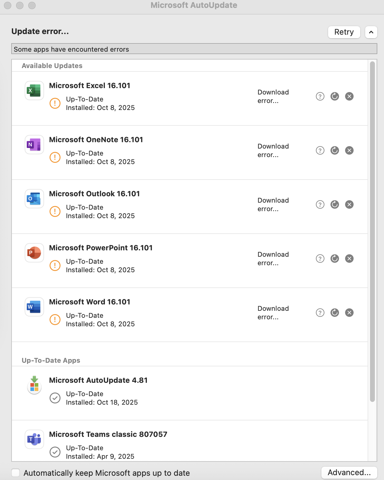I just upgraded my client’s unsupported macOS Ventura v13.7.8 to Sequoia v15.7.1 because Apple and Microsoft dropped support recently. I’m currently unable to upgrade his installed Mac Office (university’s 365 subscription) v16.101 to v16.102. It queues the updates and then “Download error…” I tried rebooting and trying another macOS account. Nothing helped.